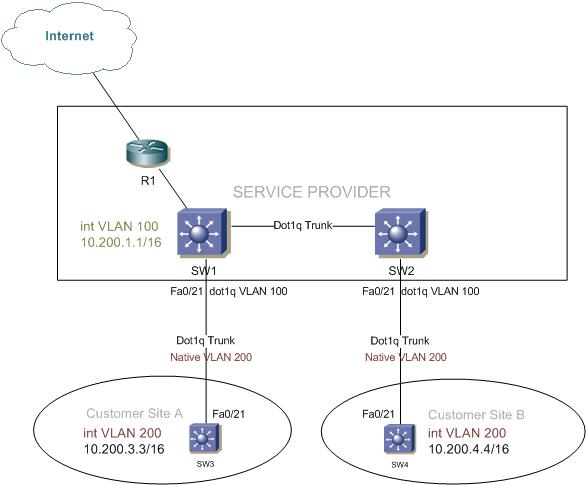 Is there a way to provide internet service over a dot1q tunnel using VLAN tunneling? Yes, there is a way, it is not the most intuitive method but works nicely. Basically it has to do with what does the switch do with untagged frames when they arrive on a tunnel port. In this configuration, the untagged frames (native VLAN 200) are not tunneled but go to the routed interface for processing. As long as the provider’s switches has a routed interface for the customer ID VLAN and a default route, traffic should reach the Internet.